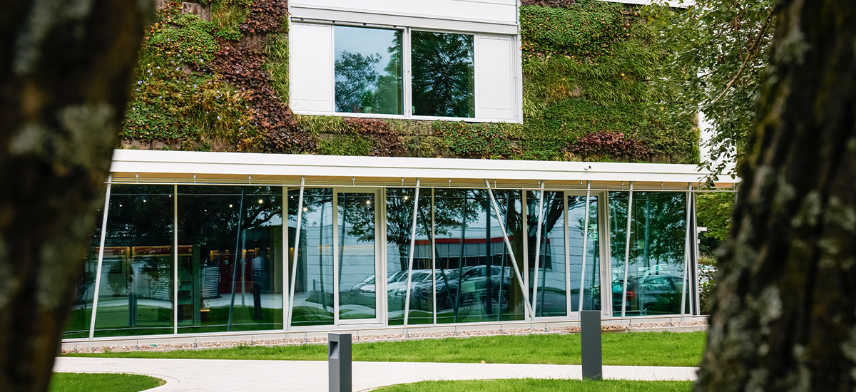 A TEC CENTER tervezése és kivitelezése nagy figyelmet fordított a fenntartható, erőforráskímélő építés szempontjaira. A zöld homlokzat koncepciójának alapja az volt, hogy az új épületet egy meglévő életközösségbe illesszék, mind vizuálisan, mind tartalmilag. Így a zöld homlokzat egyszerre kompenzáció az építkezés által elfoglalt területért, és vizuális tájékozódási pont az épület számára egy újonnan létrehozott campuson belül. A növények és rovarok magas biodiverzitása egy természetes élőhelyhez hasonlítható. Ez mindenképp hívogató látvány, és egyben érdekes is. Következő bad laasphei látogatásakor figyelje meg, mi zümmög, mászik és zürrög az épületünk bejárata mellett!